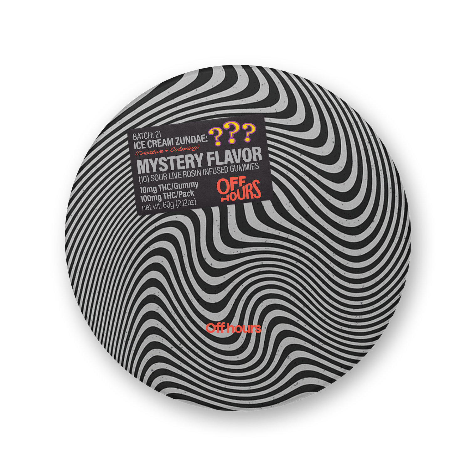 Looking for a clue? Nice try. Off Hours “Mystery Flavor” live rosin gummies are designed to keep you guessing. Paired with Ice Cream Zundae’s dessert and candy notes, they deliver a creative and calming high that might just help you solve the mystery… or not.