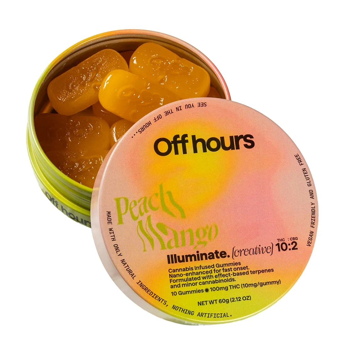 Off Hours “Peach Mango Illuminate” gummies are formulated with a unique combination of THC and CBG to inspire a creative high. Nano-enhanced cannabinoids for fast onset. Vegan-friendly and Gluten-free.
