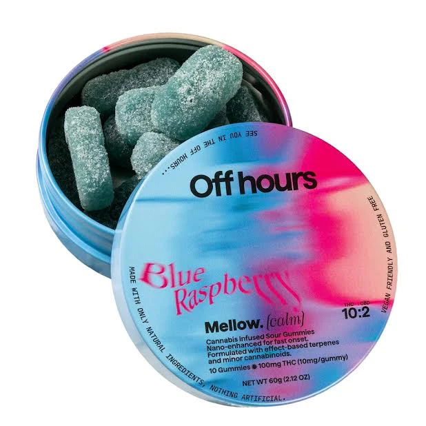 Off Hours “Blue Raspberry Mellow” gummies are formulated with a unique combination of THC and CBD to give you the perfect chilled out high. Nano-enhanced cannabinoids for fast onset. Vegan-friendly and Gluten-free.
