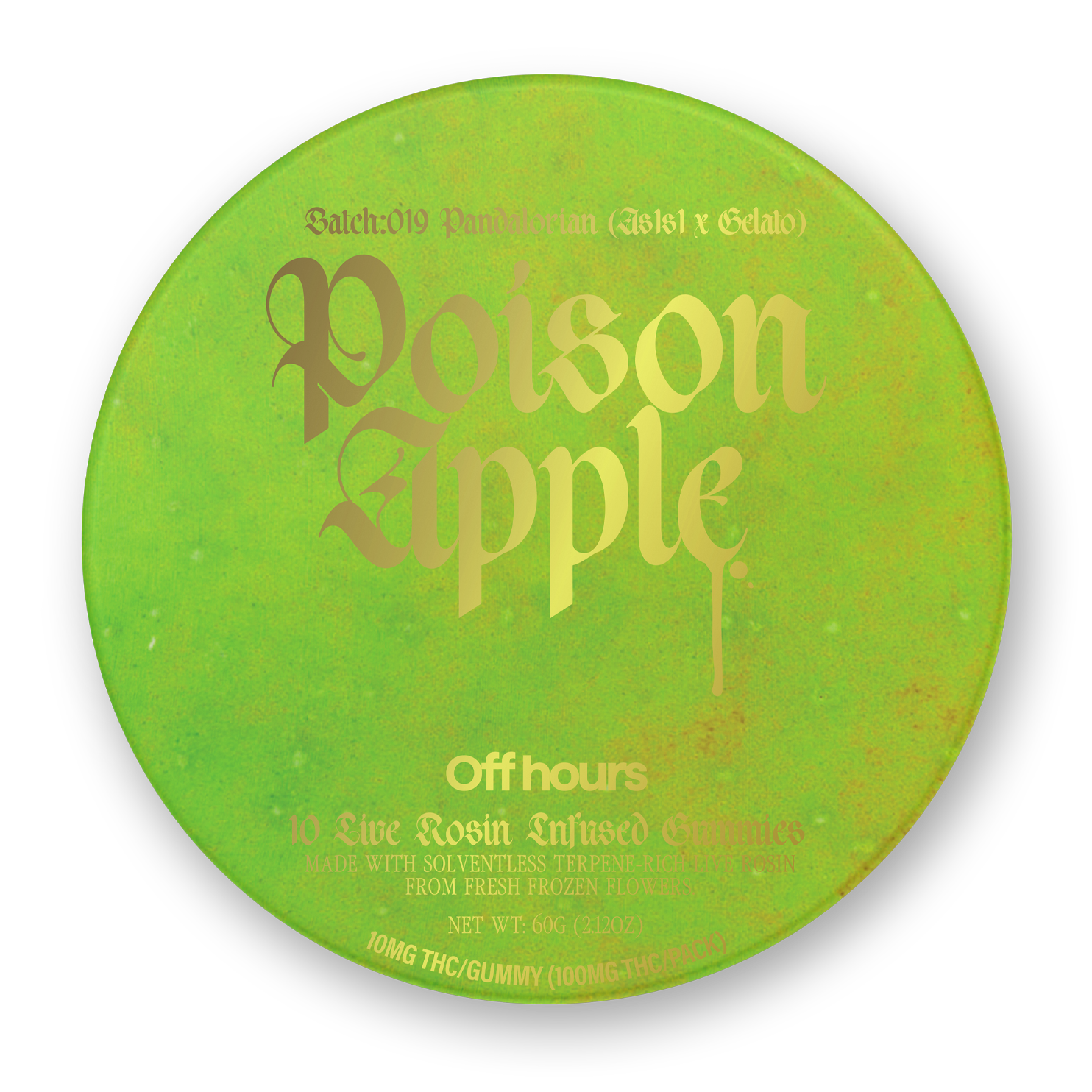 Give into temptation with Off Hours Pandalorian “Poison Apple” Live Rosin gummies. These sinisterly delicious sour apple, cherry, and cranberry gummies pair perfectly with Pandalorian’s berry sweet rosin for an irresistibly relaxing and euphoric high.