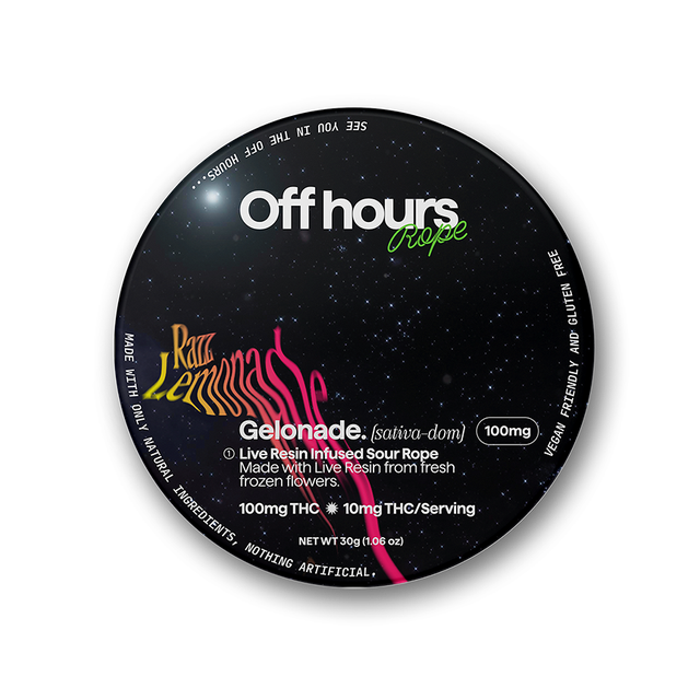 Off Hours sour Razz Lemonade ropes are infused with Gelonade Live Resin for an uplifting, chatty high. Each rope is naturally flavored with sweet raspberry lemonade to complement lemony Gelonade.