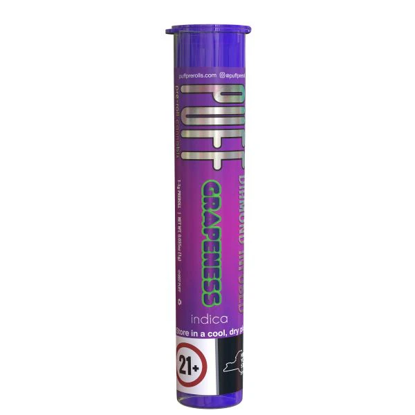 PUFF Grapeness Infused Pre-Rolls offer an exhilarating cannabis adventure. Infused with diamonds, bubble hash, and terpenes, this indica-dominant combination delivers a burst of rich, flavor and an electrifyingly potent effect. Perfect for unwinding, these pre-rolls provide a smooth, flavorful smoke with a powerful, euphoric high that will leave you feeling blissfully relaxed and rejuvenated. Elevate your smoking experience to thrilling new heights with the luxurious and intensely satisfying PUFF Grapeness Infused Pre-Rolls.